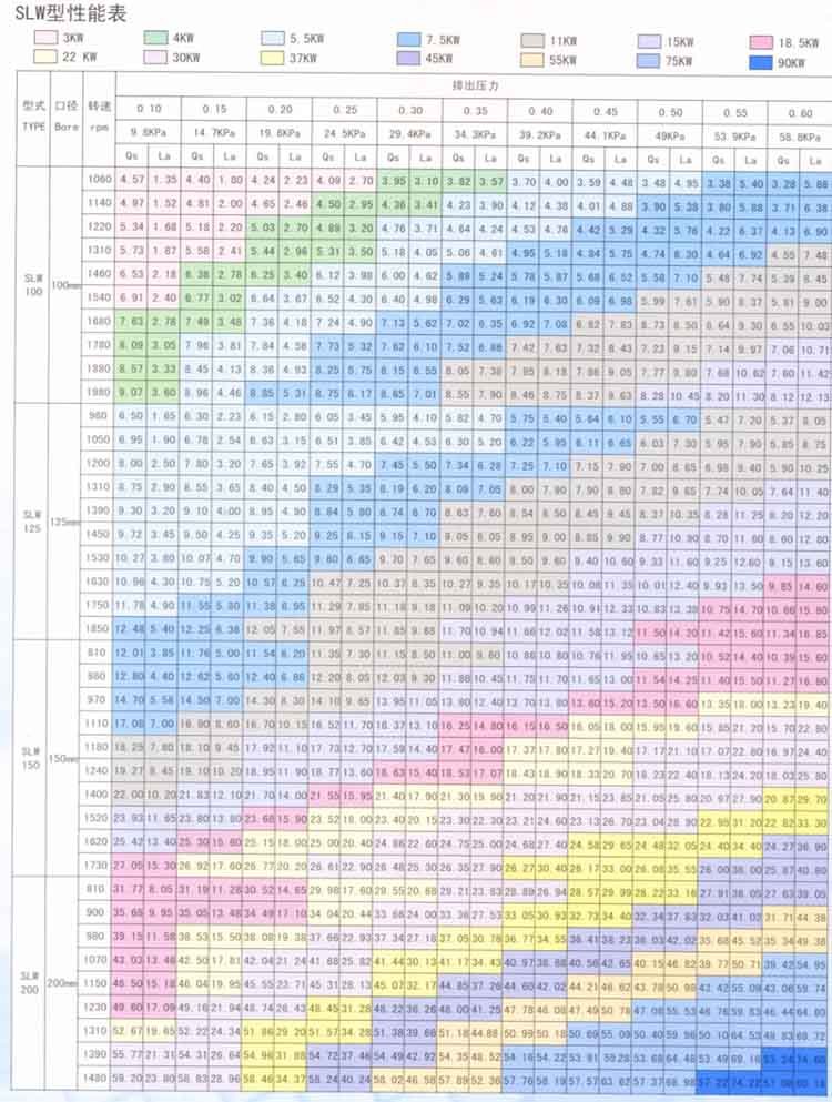 性能表示出了風機型號、口徑、轉速、排風壓力、風量和所需要動力的關系