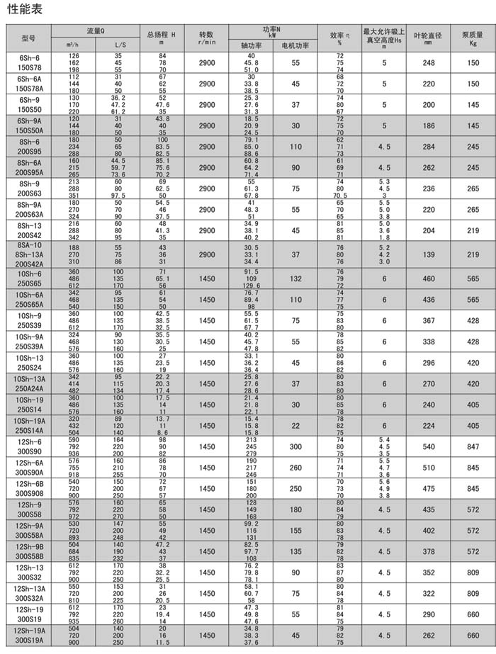 Sh.S.SA型泵是單級,雙吸,泵殼水平中開式離心泵,供輸送清水及物理化學性質類似于水的液體之用。介質溫度80℃,若兩端軸承通以冷卻水,介質可達130℃。改變葉輪,密封環和軸封的材料,可以汲送含有泥沙的渾水,泵的軸封一般采用軟填料,如有特殊訂貨要求,也可裝機械密封。