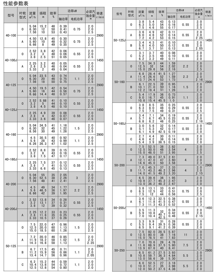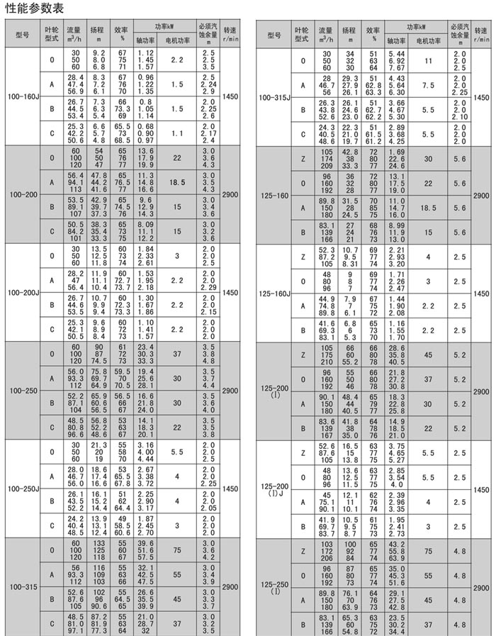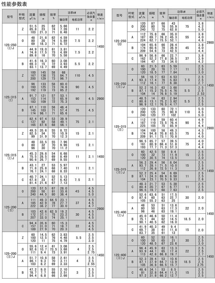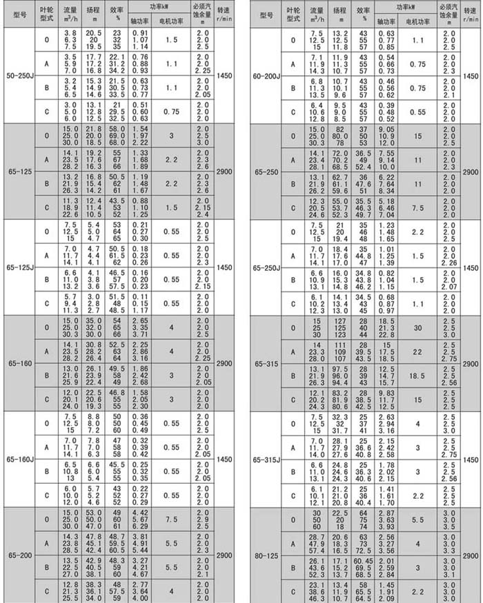采用ISO2858國際標準,流量范圍:1.5—1600m3/h,揚程:8—125m,汽蝕余量2.5—7m,每種型號泵通常分為Z.O.A.B.C五種型式,共有291個規格。